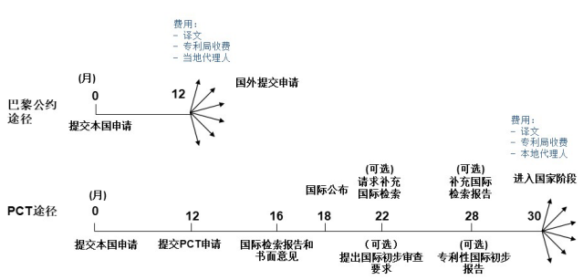 自優先權日期的12個月內,申請人也可以提交PCT申請,在優先權日起的30個月內,再考慮進入具體的某些海外國家。PCT途徑比巴黎公約途徑多了18個月的考慮時間。