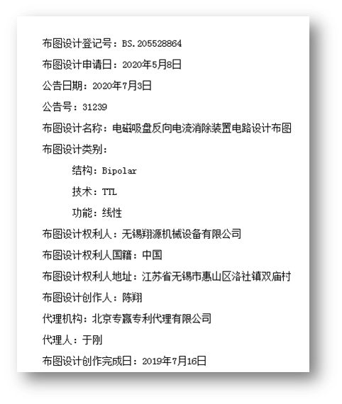 | 布圖設計名稱 | 電磁吸盤反向電流消除裝置電路設計布圖 | |