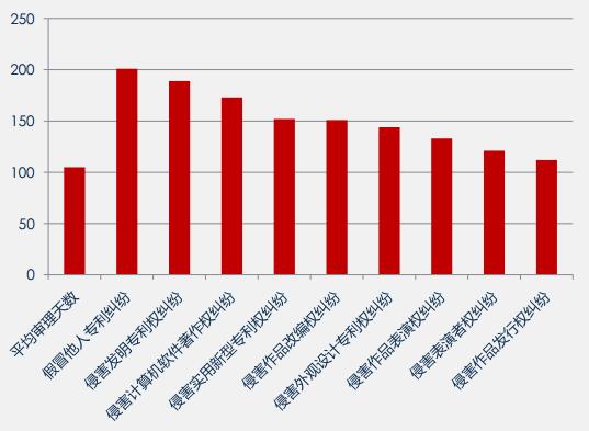 全國知識產權侵權案件平均審理周期為105天。其中,假冒他人專利、侵害發明專利權和侵害計算機軟件著作權等9類案件審理周期超過平均審理周期。