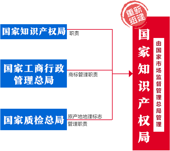 將國家知識產權局的職責、國家工商行政管理總局的商標管理職責、國家質量監督檢驗檢疫總局的原產地地理標志管理職責整合,重新組建國家知識產權局,由國家市場監督管理總局管理。